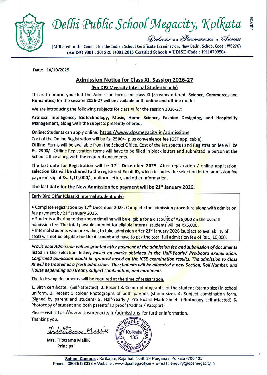 Confirmed admission would be granted based on the ICSE examination results. The admission to Class XI will be treated as a fresh admission. The students will be allocated a new Section, Roll Number, and House depending on stream, subject combination, and enrolment.