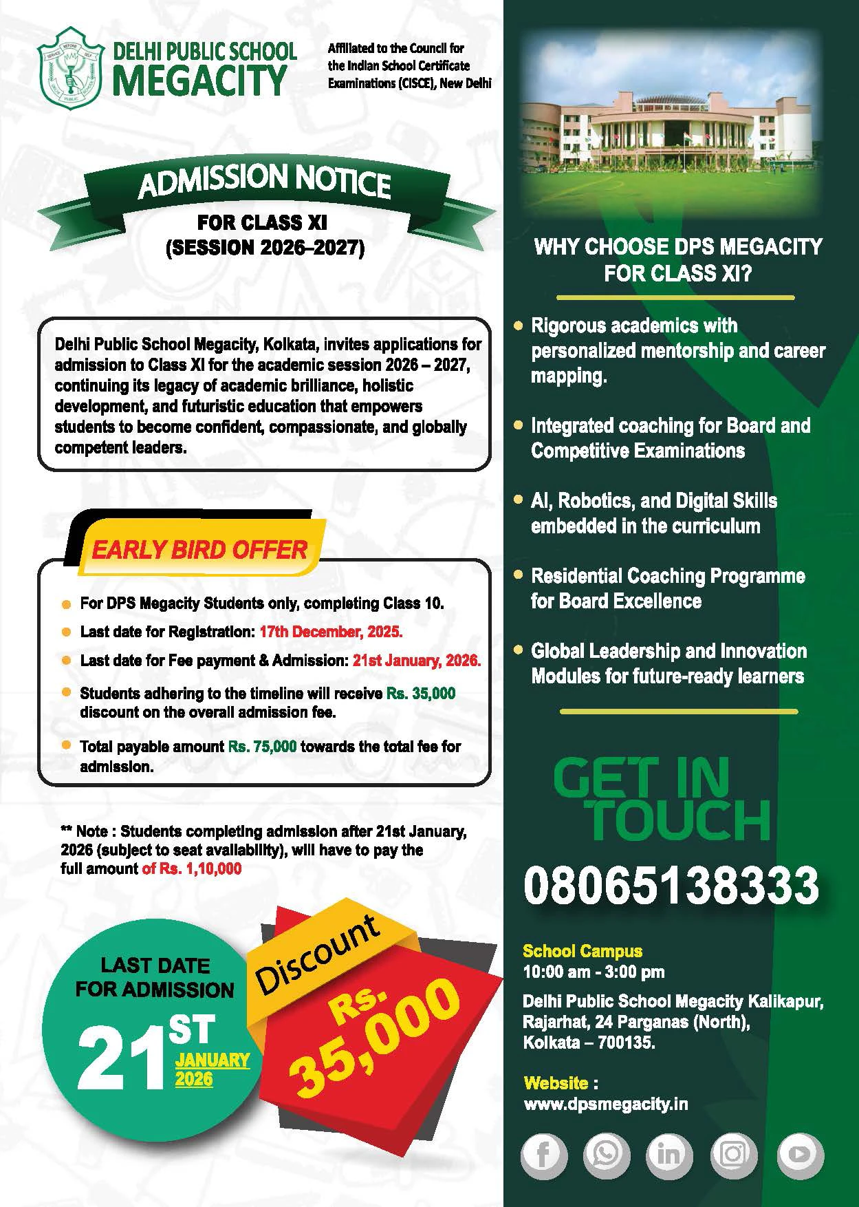 - Online: Students can apply online: https://www.dpsmegacity.in/admissions. Cost of the Online Registration will be Rs. 2500/- plus convenience fee (GST applicable).