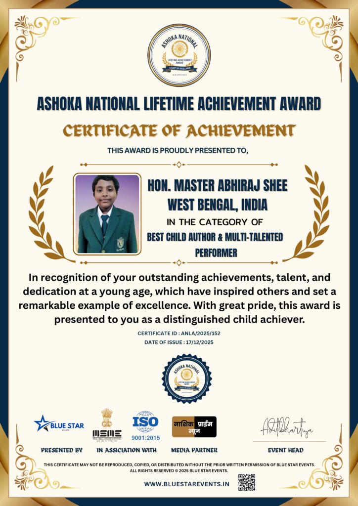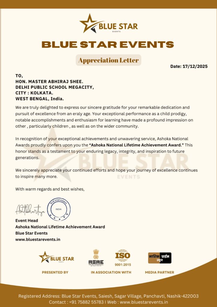 Abhiraj Shee of Class 6 is awarded “Ashoka National Lifetime Achievement Award” as a “Child Author and Multi-talented Performer” by Blue Star Events, a Maharashtra based organisation. This is published in different media like Nashik Prime News, Digitalwarta and so on.