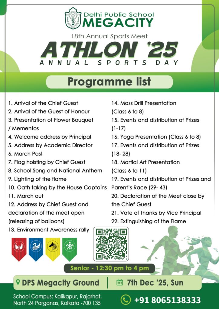 On 6th December 2025, the Junior School students will take center stage, bringing together the youngest learners and the senior-most athletes in a dynamic celebration of skill and perseverance.On 7th December 2025, the spotlight shifts to the Pre-Primary and Senior School, where budding talents will shine through exciting races, drills, and team events.The two-day extravaganza promises to be a festival of fitness and fun, reflecting the schoolβs commitment to holistic education and the joy of sportsmanship. With enthusiastic participation, colorful displays, and a spirit of healthy competition, Athlon β25 will truly embody the motto: